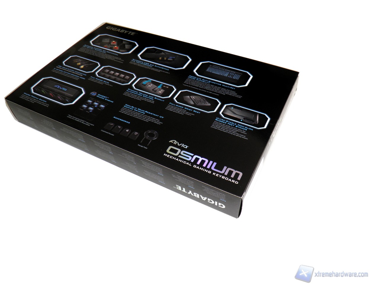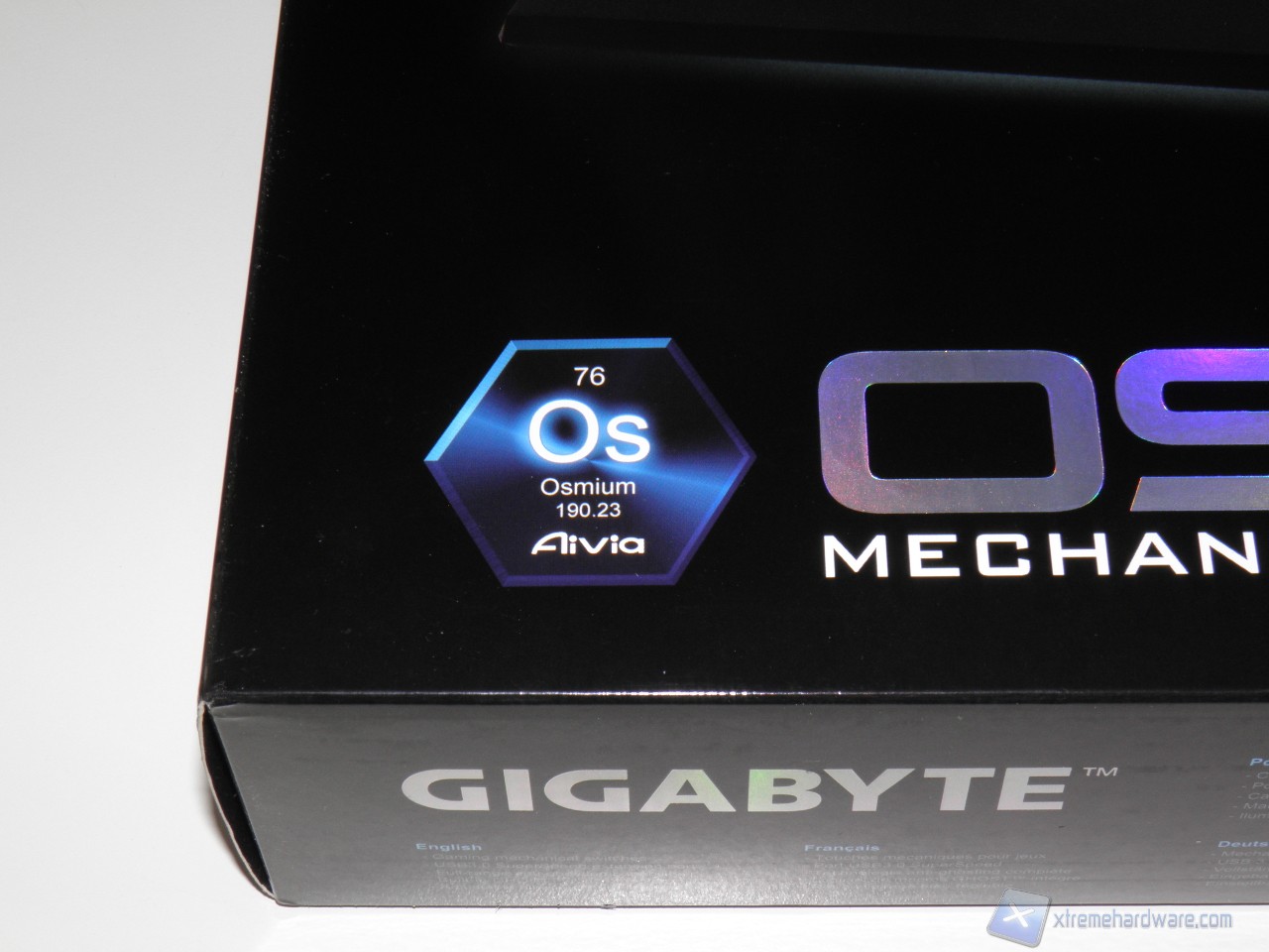 La confezione con cui ci arriva la Gigabyte Osmium è davvero di dimensioni imponenti. La parte frontale raffigura la tastiera in tutta la sua interezza, viene messa ben in evidenza la presenza di Cherry MX Red e si può apprendere l'origine del nome, Osmium, che è l'elemento numero 76 della tavola periodica.