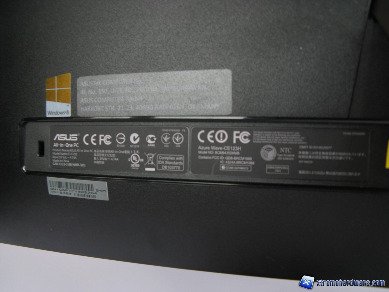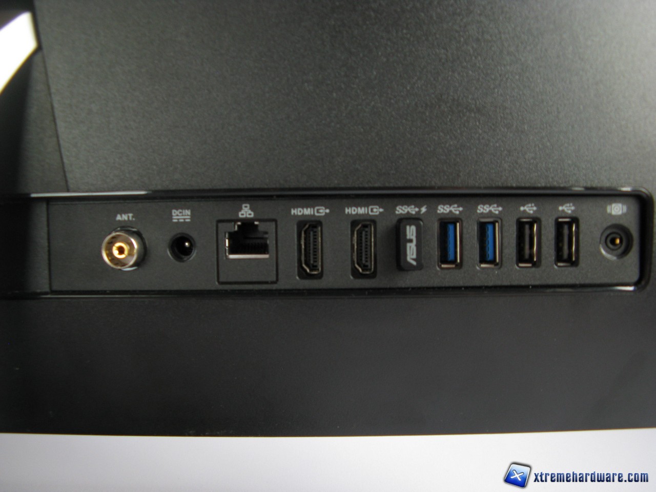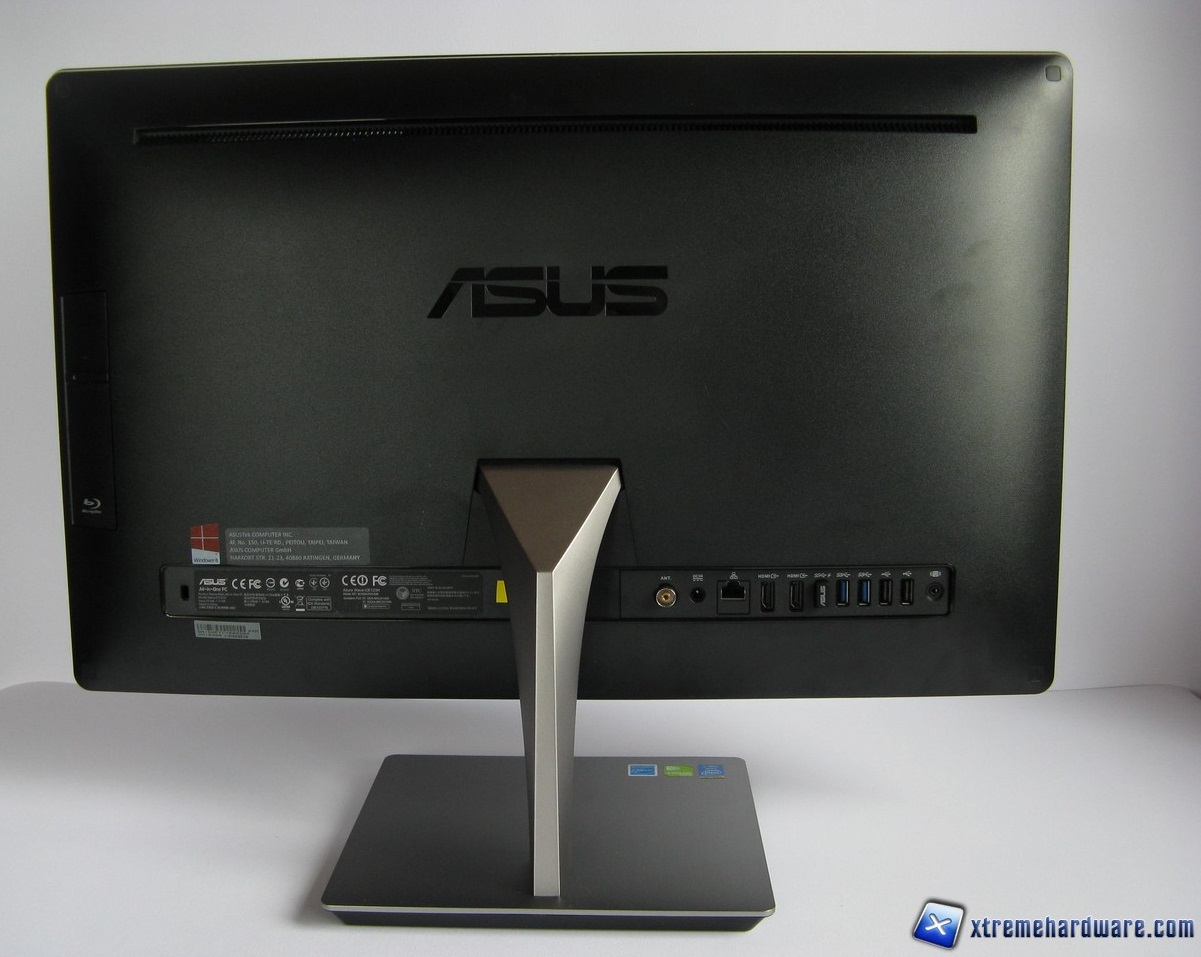 Passando al retro del computer notiamo il grande logo Asus che sormonta il piedistallo al centro e che riprende quello collocato frontalmente nella parte inferiore dello schermo; alla sinistra della staffa di sostegno per il display troviamo un paio di etichette con i dettagli del PCe dell'OS installato ed il Kensington lock; sulla destra ci sono tutte le porte di cui è dotato questo PC. Partendo da sinistra abbiamo: