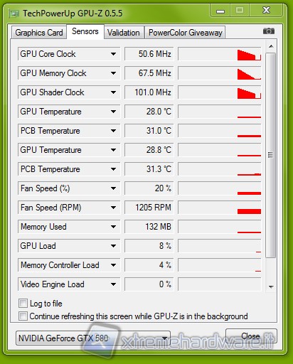 Tale sistema riesce a gestire ottimamente le frequenze base della scheda video (overcloccate rispetto alla versione standard) e le temperature in idle si aggirano al di sotto dei 30° anche con la velocità delle ventole al minimo, in full le temperature salgono di poco e con FurMark raggiungono gli 80° dopo circa otto minuti. Ricordiamo che a differenza delle GTX 580 Reference, queste schede non implementano la protezione che porta ad an abbassamento del clock nei benchmark più pesanti, tipicamente FurMark e MSI Kombustor. Le temperature rilevate in questi test sono quindi un caso estremo difficilmente raggiungibile durante le sessioni di gioco.