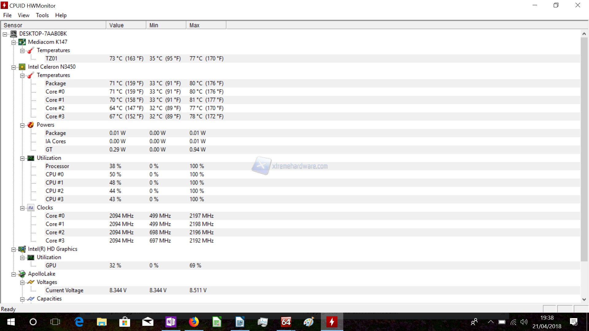 Temperature abbastanza buone considerando che questa CPU ha un sistema di dissipazione passivo, ossia privo di ventole. In idle questo la CPU fa segnare 34°C, temperature che durante la riproduzione video e multitasking pesante arriva a toccare gli 80°C. Questo ultimo valore è agevolmente migliorabile cambiando la pad termico sopra la CPU con una più performante pasta termica.