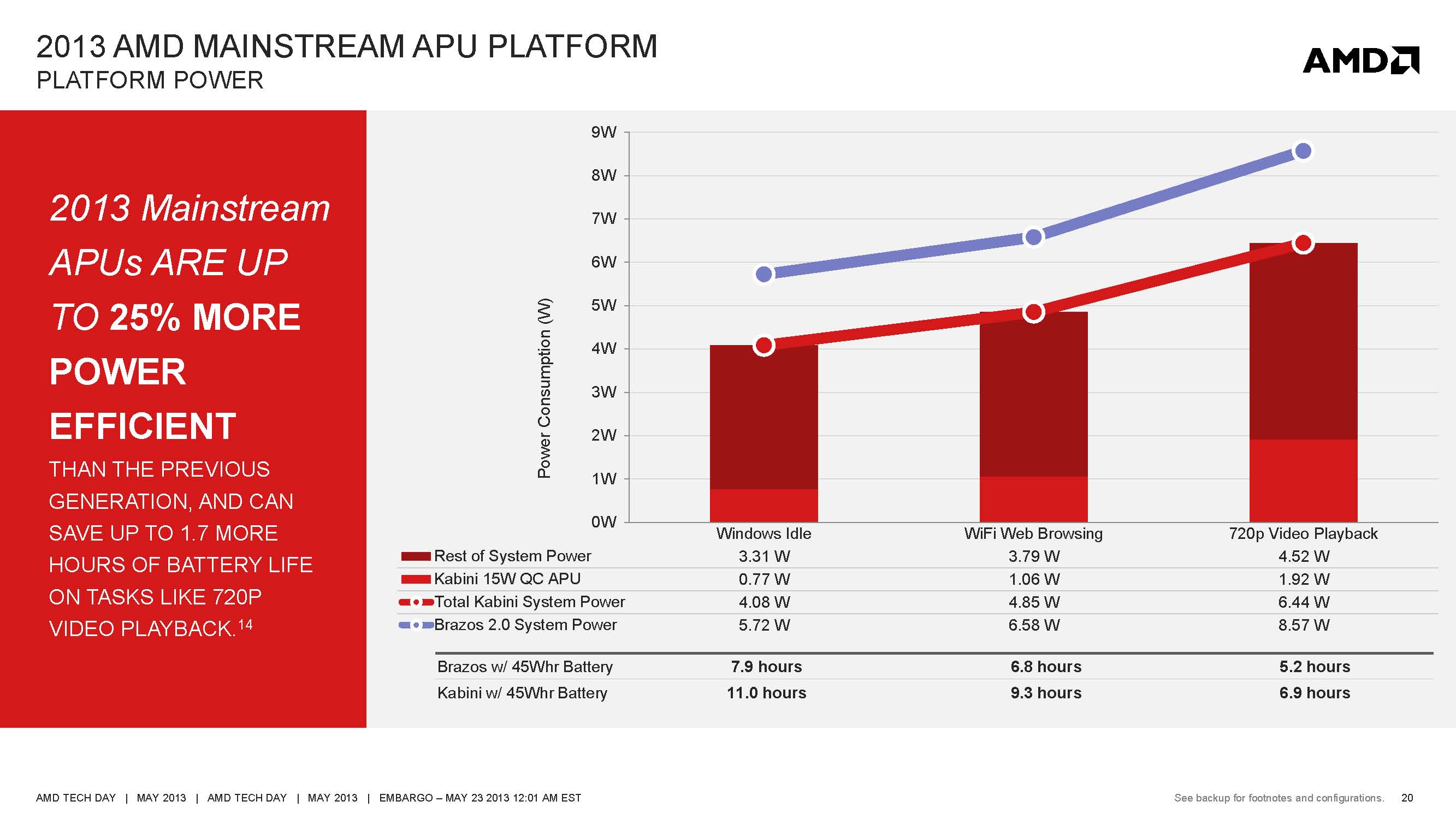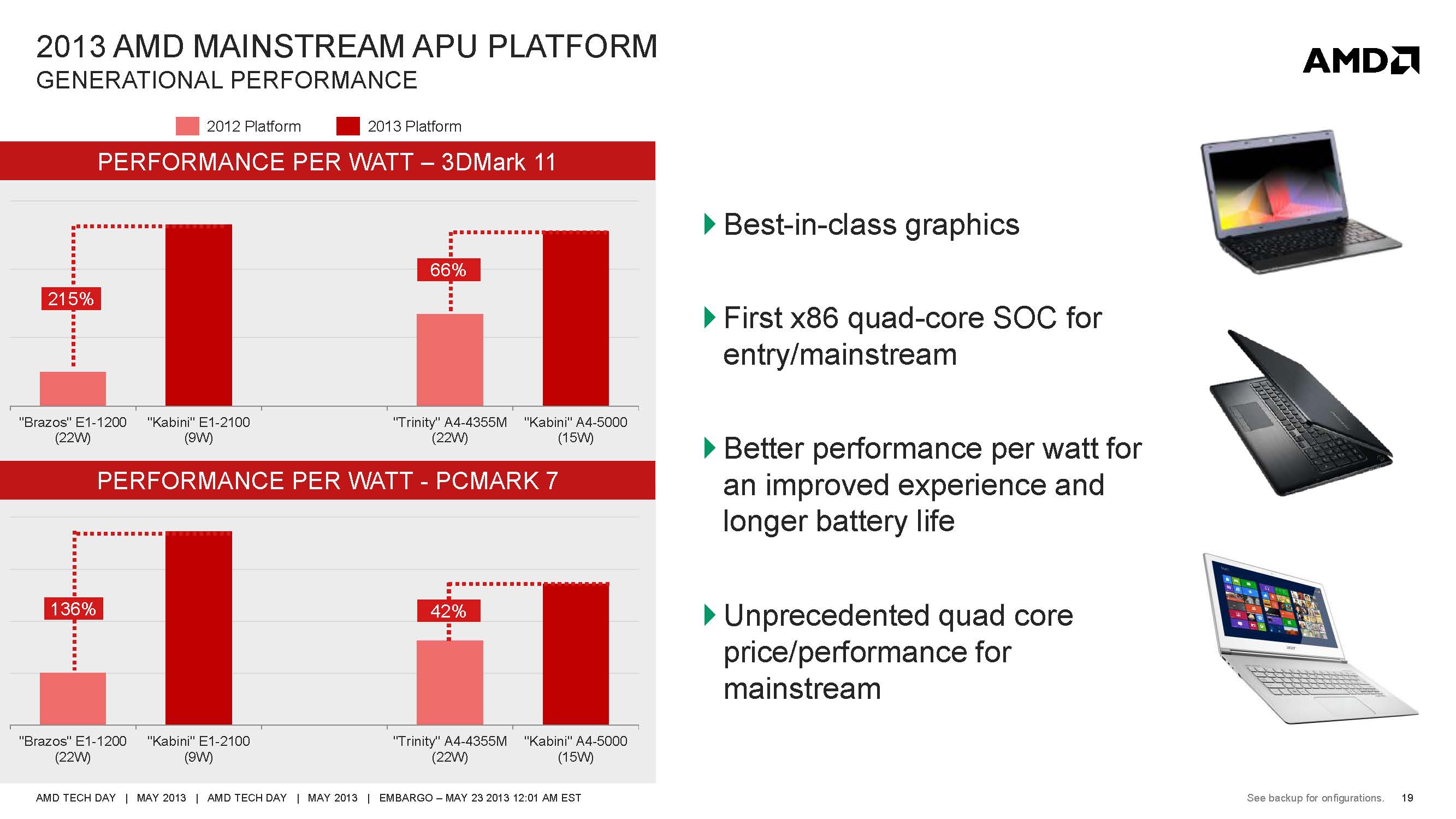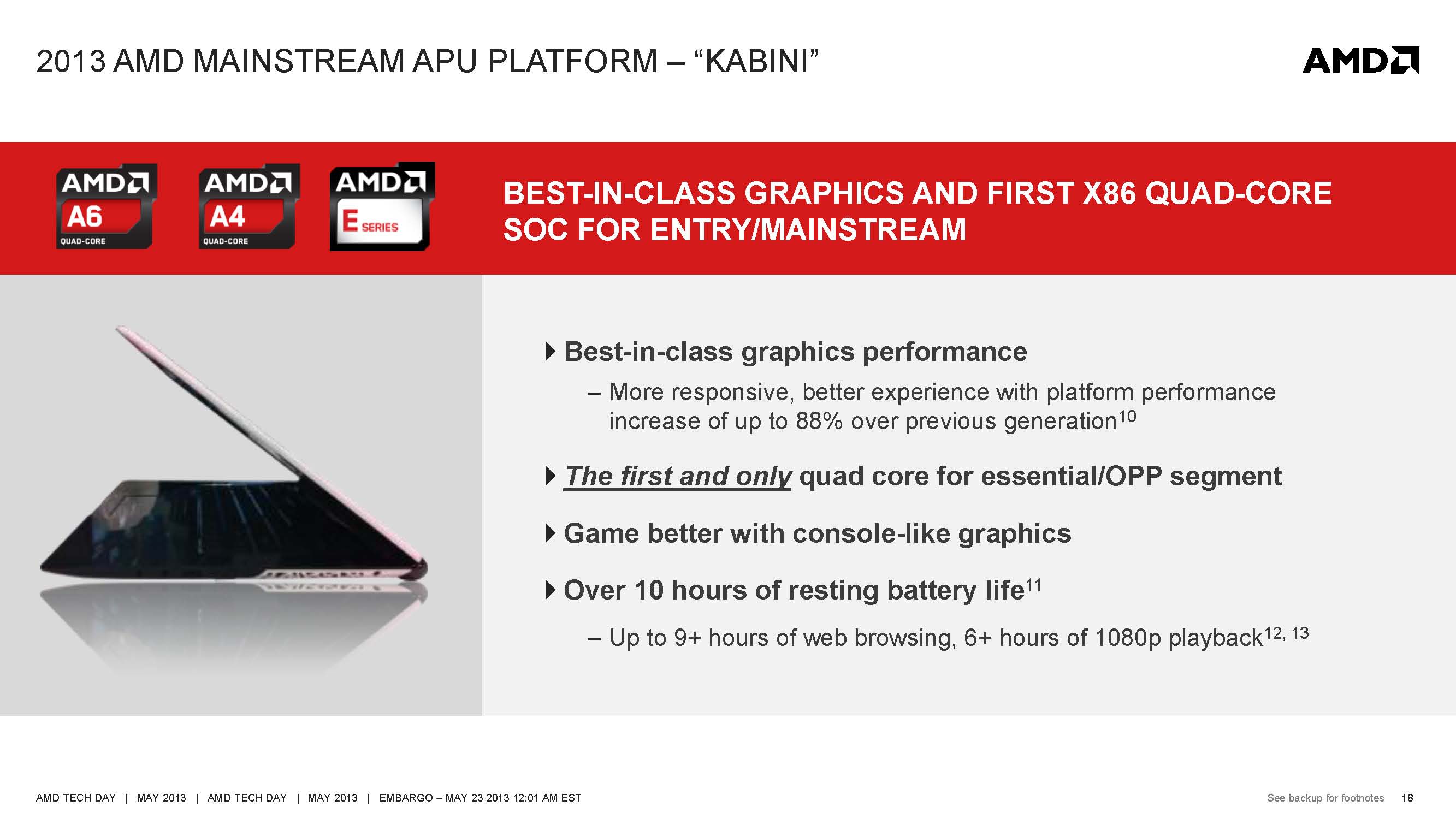 Per quanto riguarda invece il settore APU di fascia Mainstream, AMD presenta la piattaforma Kabini caratterizzata dalla migliore grafica e dal primo quad core System on Chip x86. Kabini si propone di aumentare le performance del settore grafico dell'88% rispetto alla precedente generazione ed allo stesso tempo garantire una maggiore reattività. Grafica di alto livello superiore a quello delle console con una durata della batteria davvero elevata. Un aspetto su cui AMD si focalizza è l'aumento delle performance per Watt per incrementare in maniera considerevole la durata della batteria senza inficiare sulle prestazioni; un fattore chiave che non ha precedenti con APU più efficienti del 25% rispetto alla precedente generazione e che è in grado di aumentare la durata della batteria di 1.7 ore con la riproduzione di filmati in 720p.