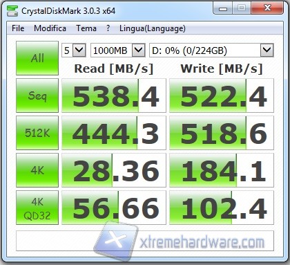 CrystalDiskMark è un utilissimo software per misurare le performance in lettura e in scrittura in modo sequenziale (sequential) e casuale (random), grazie al pieno supporto del NCQ (Native Command Queuing) l'ordine degli IOPS viene ottimizzato in modo da migliorare le prestazioni di input/output con una Queue Depth (file in coda) di 32, tale test consente di osservare il comportamento del drive durante il trasferimento di numerosi file con dimensioni ridotte.